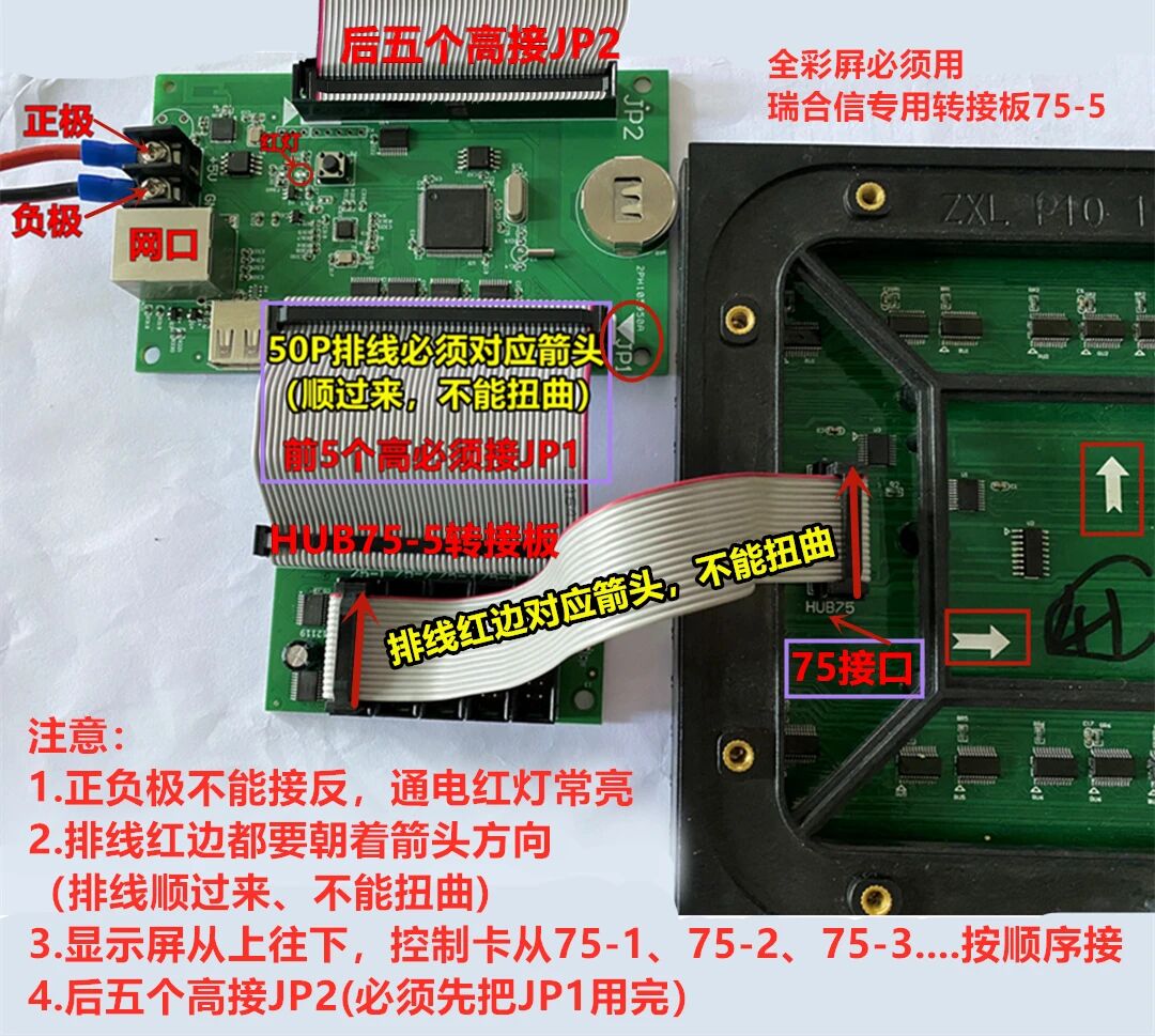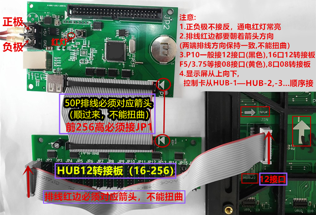 2.排线红边要对应HUB接口第一脚位置,A——A,B——B,OE——OE等(单元板和控制卡接口对应都要保持一致);